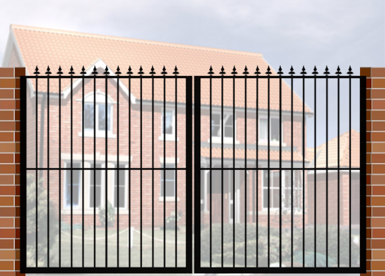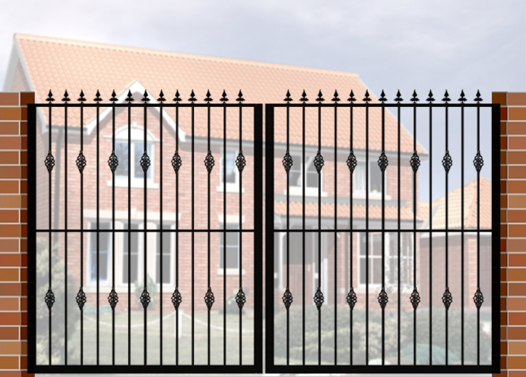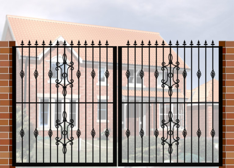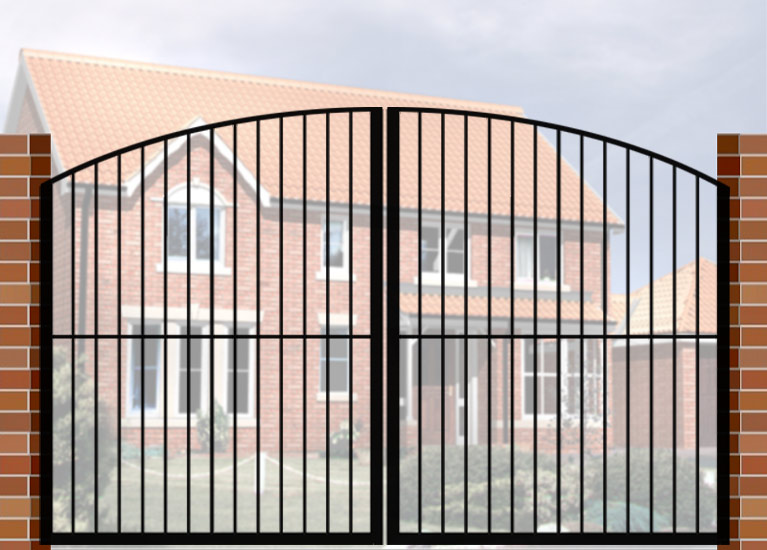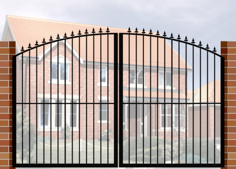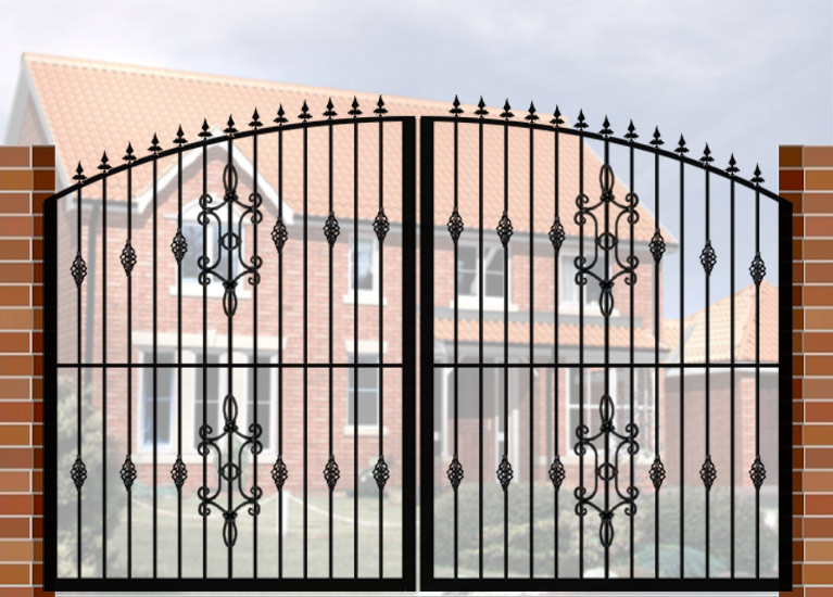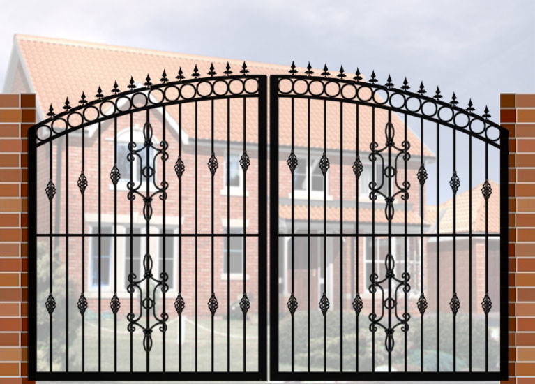 Double Gate with Curve Top (DG02) £560.00 Wrought Iron Style Gate with Curve Top, 3600mm x 1800mm. Made from high quality materials and supplied with fixings.