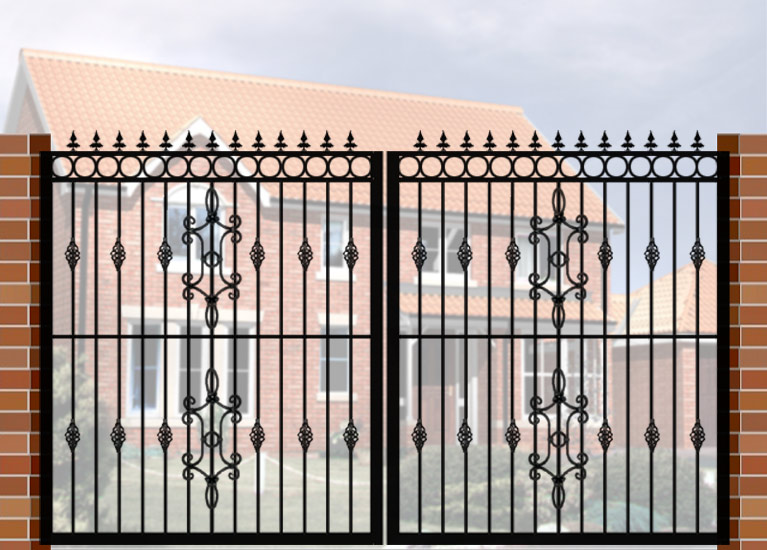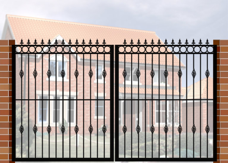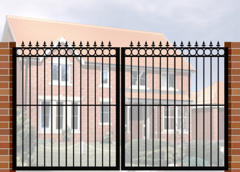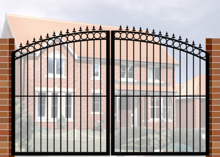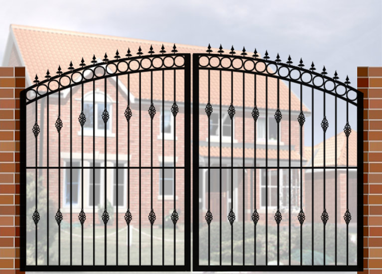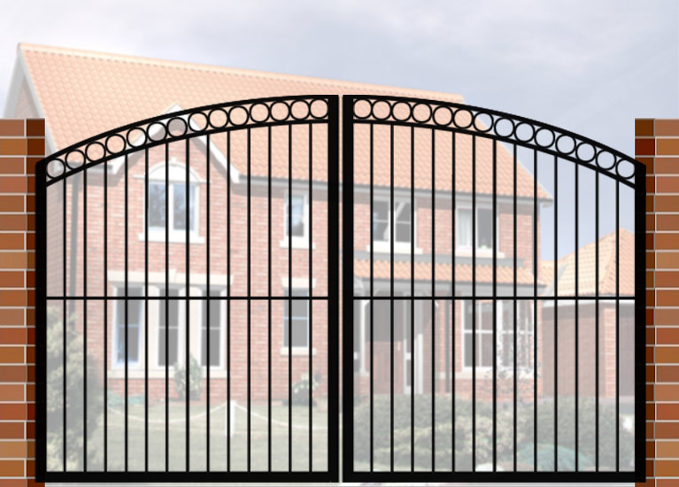 Double Gate with Curve Top & Circle Header (DG04) £660.00 Wrought Iron Style Gate with Curve Top & Circle Header, 3600mm x 1800mm. Made from high quality materials and supplied with fixings.